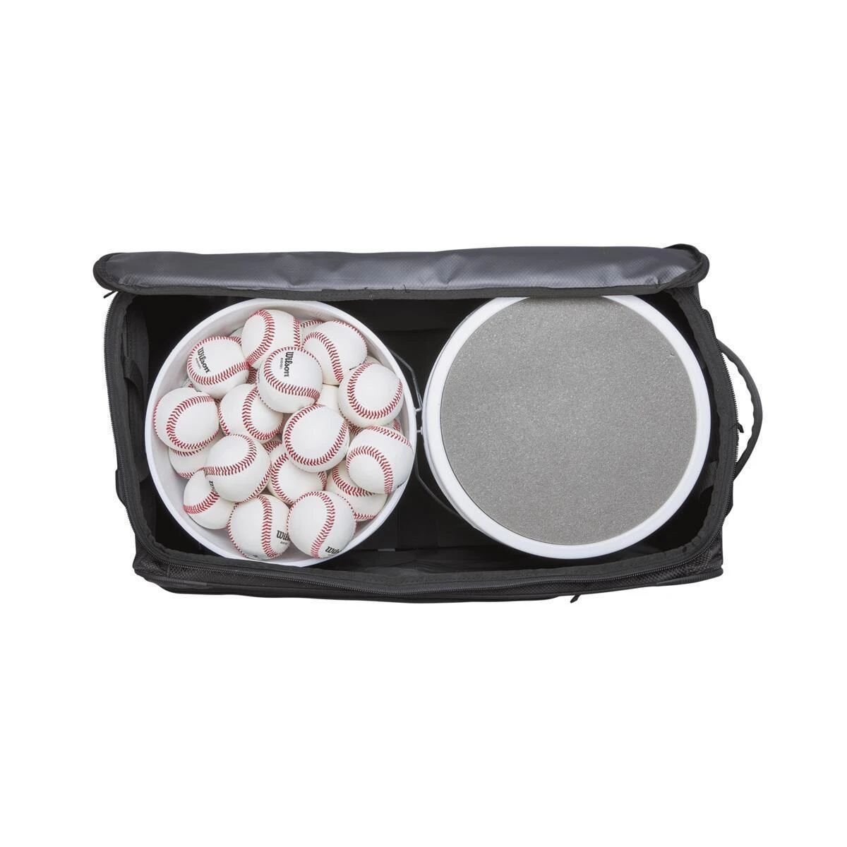 - Holds two six-gallon buckets of baseballs or softballs (Buckets are Not Included)